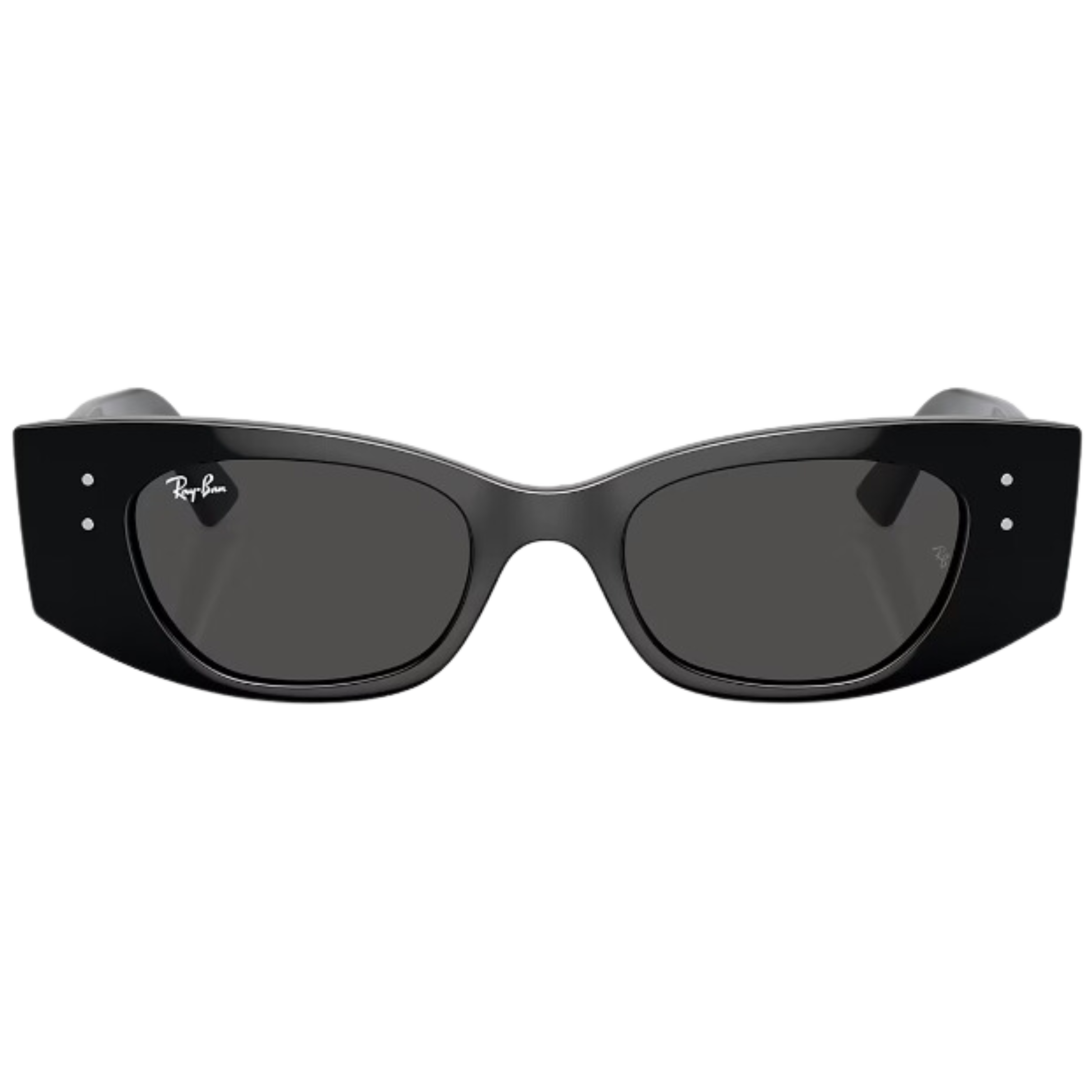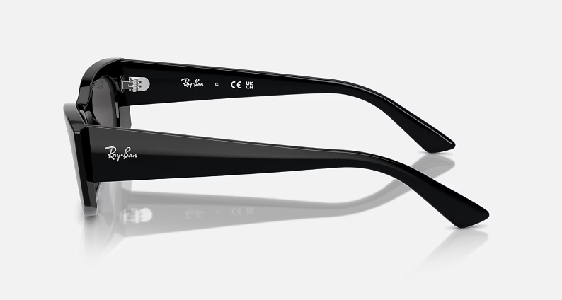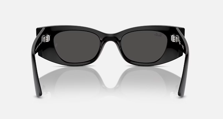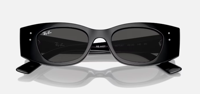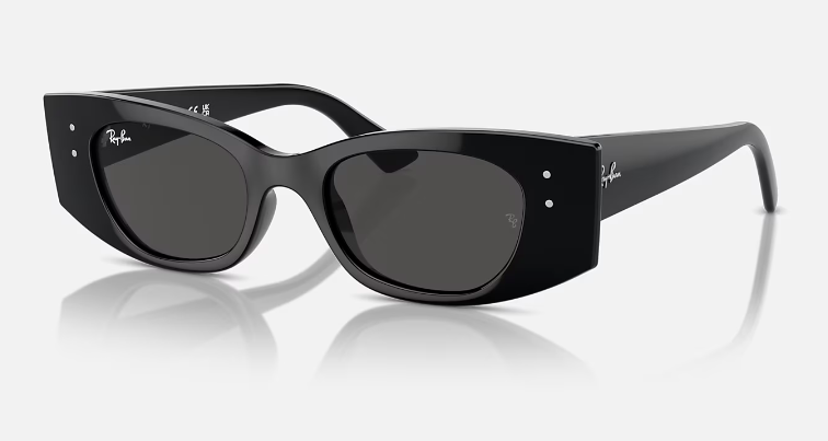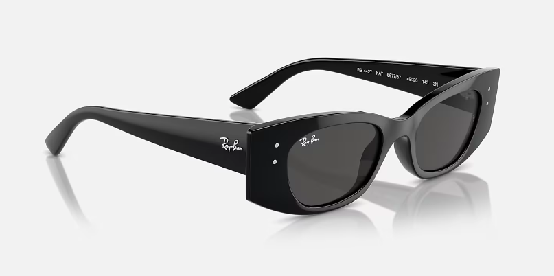 Scopri i Ray-Ban Kat Bio-Based RB4427: occhiali da sole con montatura irregolare in materiale iniettato lucido nero, aste coordinate e lenti grigio scuro con trattamento Classic, ideali per uno stile unico e sostenibile, con una protezione ottimale dai raggi solari.